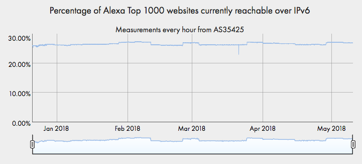 - Alexa Top 1,000 Websites: 28% with working IPv6 (up from 23% in 2017)